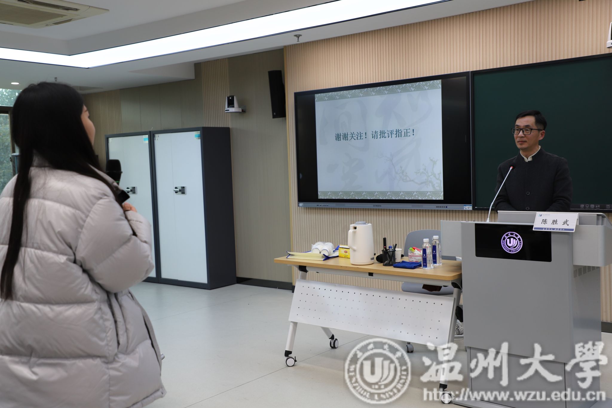 在提问环节,黄星竹同学关于”音义结合中音被忽视的作用“进行提问,并对讲座中”孤馆“为何还可以作为“仄仄”向老师请教;苏紫依同学提到温州公交车上的温州方言,并对其发音进行了提问;章艳丰同学则详细询问了姓名吟诵的方法。老师对同学们的听课状态和问题请教表示充分肯定,并详细解答同学们的疑问。