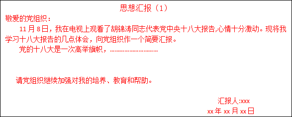 (4)一定要及时,汇报的要是自己最新的思想工作情况。