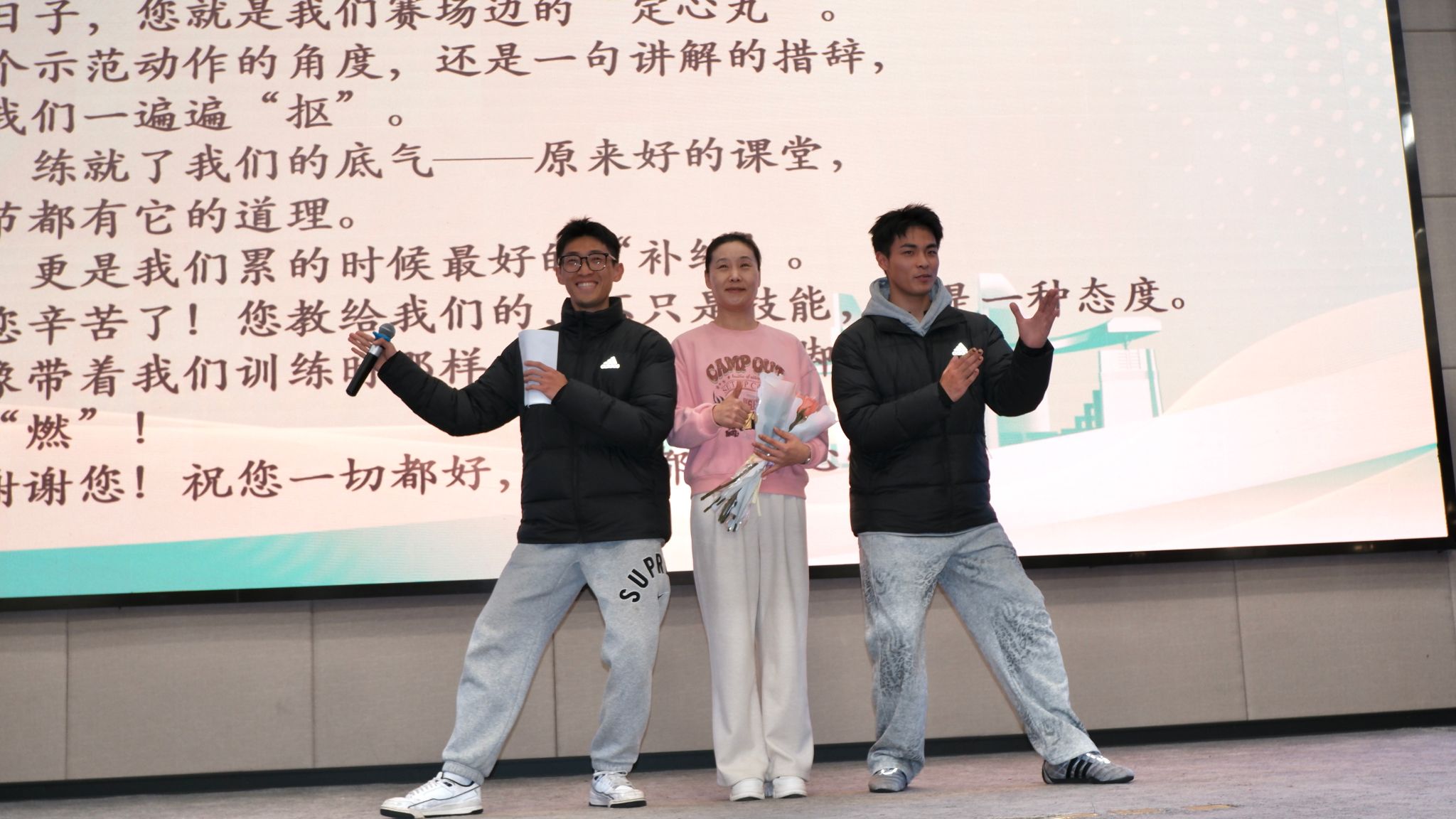 本次大会以“鲜花”为主要意象,串联起了致敬、感恩与传承的温暖旅程。首先是“鲜花致敬老师”环节。在教育这片沃土上,指导老师们始终以悉心的教导与无私的奉献,陪伴着一届又一届学子成长,是他们学业与人生道路上的重要引路人。随着仪式的推进,来自各个学科组的校队成员代表依次走上舞台,手持鲜花,向陪伴自己备战、给予自己指引的老师们致以最真诚的敬意与感激。师生们脸上洋溢着笑容,温暖的互动与台下阵阵响起的掌声相映成趣,现场充满敬意与感动的氛围。