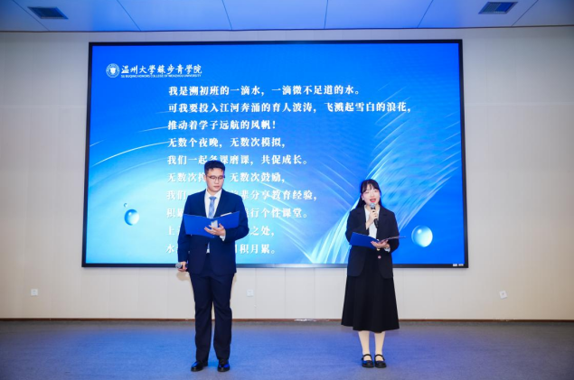 坠露添流,以点滴露珠壮大教育洪流。“溯初班”学员代表陆以恒、黄澄浩以诗言情、以歌言志,一首原创诗歌《我是溯初一滴水》道出了溯初班学子甘为教育乳汁、无私助学的崇高理想,道出了一心向学、脚踏实地的求学态度,道出了强化实践研学、助力生命成长的宏伟蓝图,是“溯初班”学员对教育事业最深沉的告白。