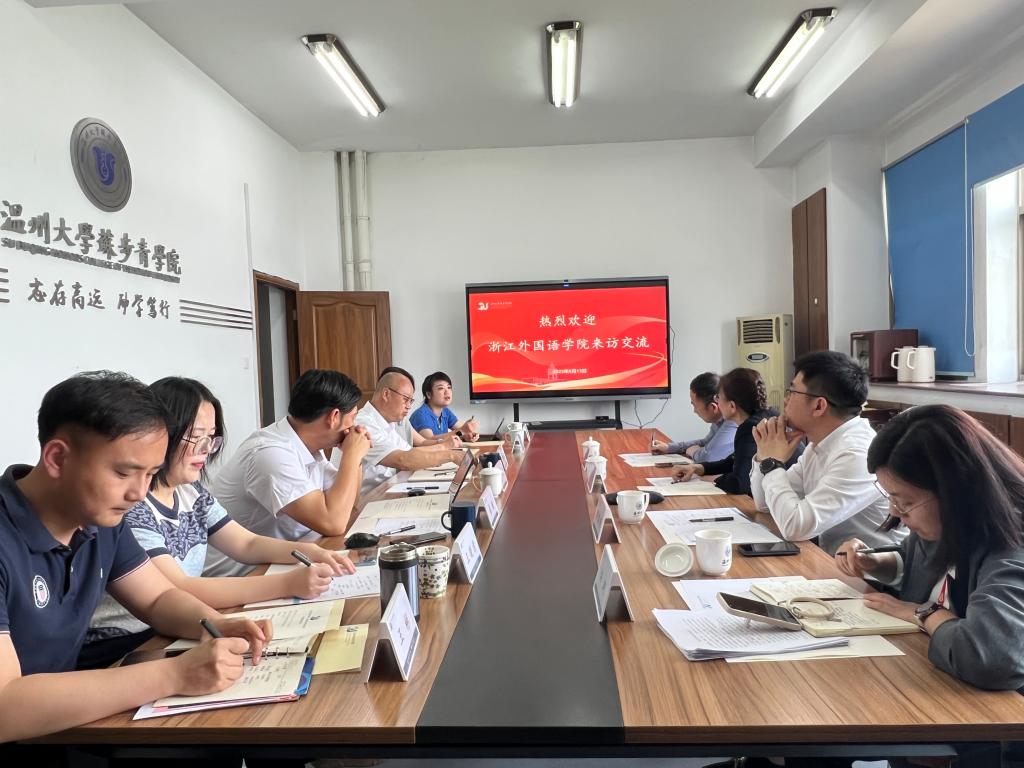 的热情接待表示感谢,并以“老学校、新青年、精致校” “三地四域”为关键词介绍了浙江外国语学院的基本情况及战略发展目标。双方就教育教学、校园文化与教学管理等方面进行深入的交流和探讨,参会人员纷纷表示,教育教学要适应社会发展变化,要关注学生综合素质的培养,并强调勇于创新,不断推进教育教学模式改革,以实现学院高质量内涵式发展。