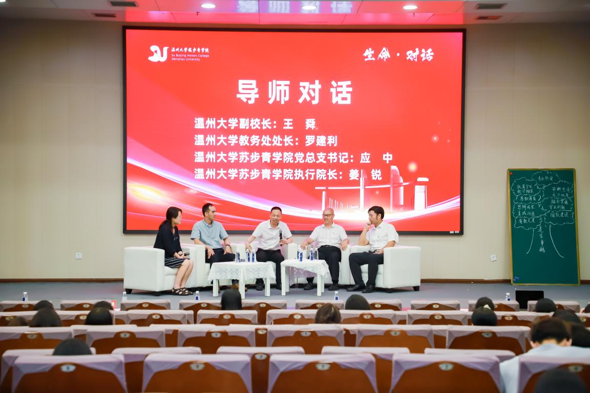 随后,胡珏老师与王舜、罗建利、应中、姜锐四位导师开启了导师对话环节。王舜讲述了成长历程中面临重大变故和“卡脖子”难题时的认识和思考,勉励学员们在面临困难挑战时,应当具备积极的心态与高昂的斗志;罗建利从自身成长经历出发,向学员们传达了求学处事脚踏实地、一步一个脚印品质的重要性;应中讲述了自己从语文老师跨专业深耕体育教育事业的故事,向学员们说明了学科之间的相通性以及跨学科学习的重要性;姜锐分享了带领团队的经验,鼓励学员们积极提升团队协作能力与团队领导能力。四位导师的对话热烈,台下学员们聚精会神,掌声涌动。