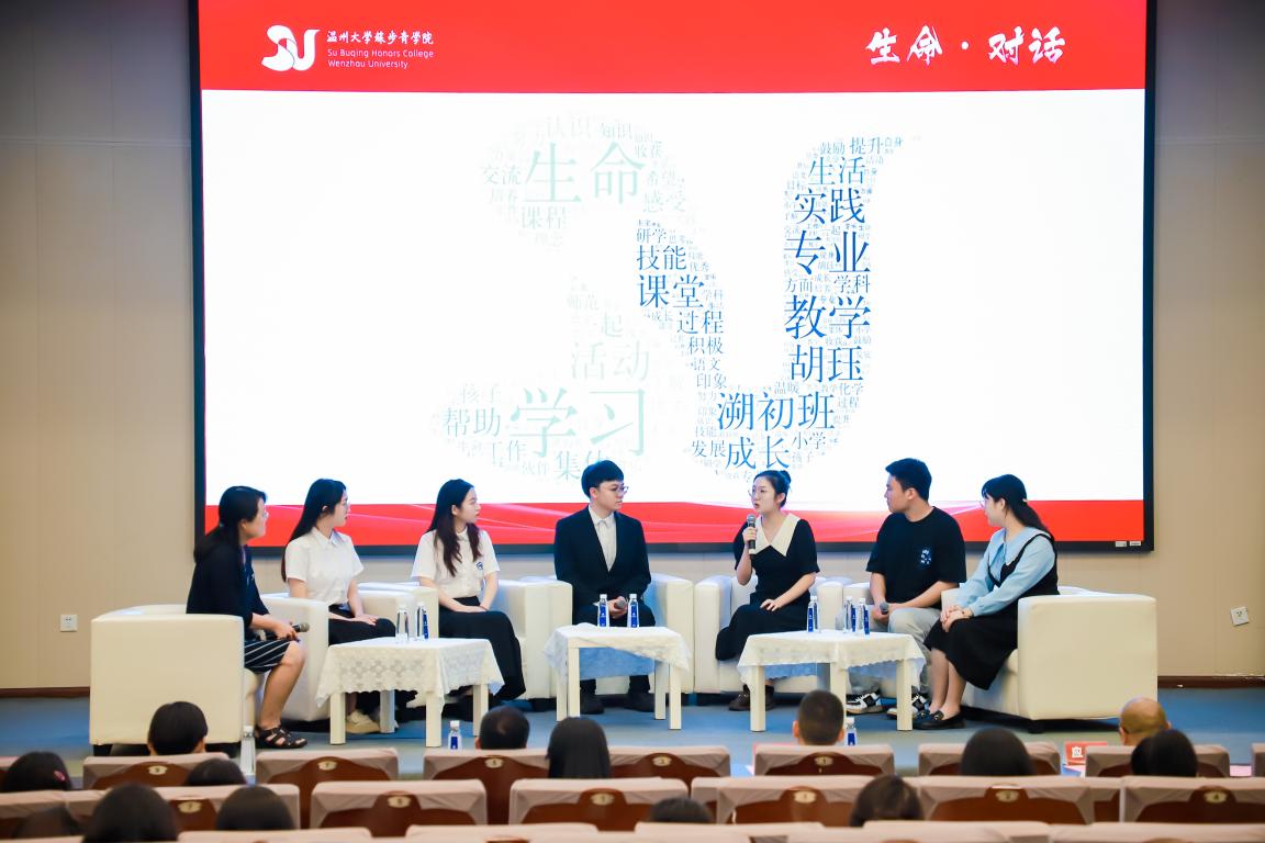 典礼伊始,师生们分别开展了以“生命·成长”为主题的对话,共同探讨教育、生命成长的本质。首先由来自第十二、十三、十四、十五期的学员们展开对话,分享他们在“溯初实验班”的成长经历及毕业后的工作经历。第十三期学员倪安舒表示,在实习成绩和师范技能院赛成绩不理想的双重打压下,是“溯初实验班”各位导师的开导、同伴的相互鼓励让她重拾自信,立下努力成为一名“明师”的志愿。第十二期学员杜泱霆作为已步入社会的前辈,分享了她的班主任经历,面对游离于班集体之外的孩子“果果”,她用自己的爱心和耐心建立起家校协同的教育机制,帮助他完成了从不愿意做操到能够领操的转变。十四、十五期学员代表在学长姐分享的过程中通过板书的形式记录下心得体会,串联起生命成长之树,体现了教育理念传承的意义。