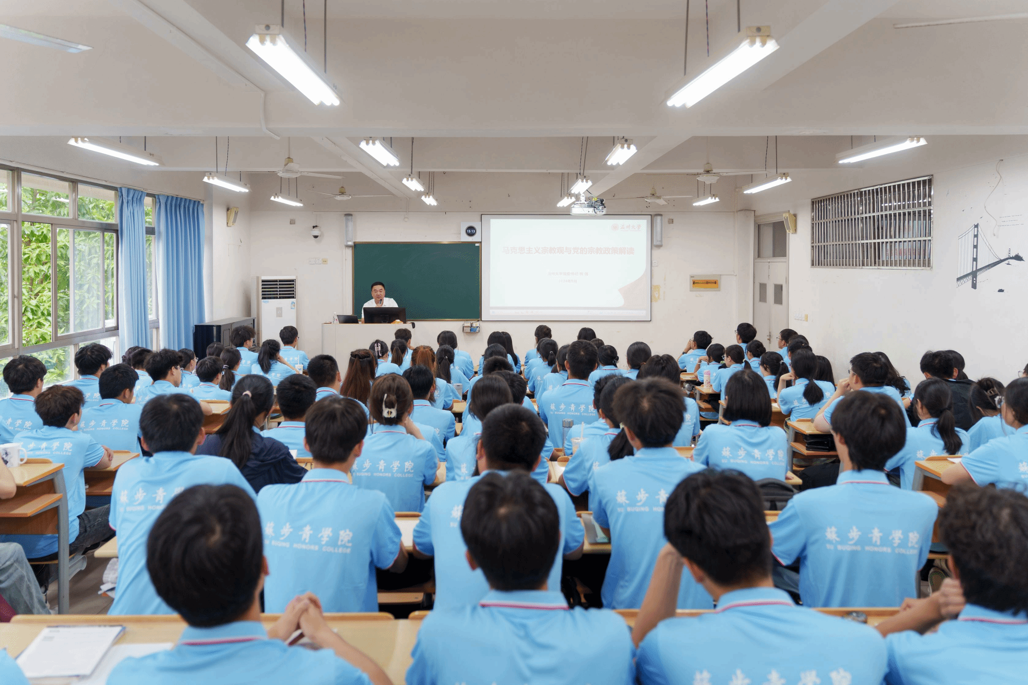 调研结束后,钱强书记为学院2024级新生上了一堂《形势与政策》课。他勉励青年学生要好好学习,打好基础,积极实践。钱强书记告诫青年一代学生要维护意识形态安全,提高网络安全意识,防止宗教渗透。争当有理想、敢担当、能吃苦、肯奋斗的新时代好青年。课程结束后,钱强书记向学生赠送了《苏步青传》,并与全体学生合影留念。