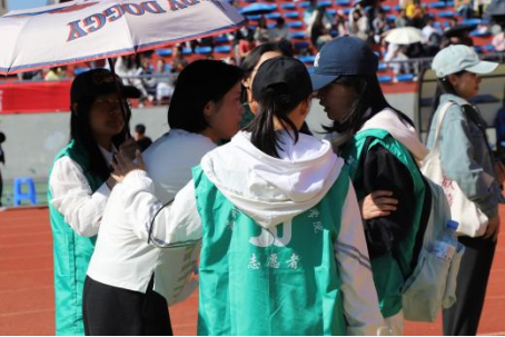 即使秋风带着一丝凉意,也未能减弱志愿者们的服务热情。在这个充满挑战与竞争的赛场上,一群身穿绿色马甲的志愿者们忙碌于赛场的每个角落。他们总是出现在需要的地方,无论是提醒运动员检录,还是通知观众比赛时间;无论是协助完赛运动员,还是用相机记录下运动员的奋斗时刻。这些默默奉献的同学们虽然没有直接参与比赛,但他们的贡献同样值得尊敬,成为运动会一道亮丽的风景线。