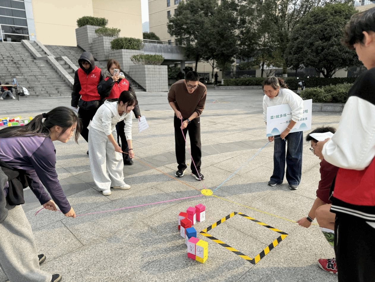 师生充分展现了极强的团队协作能力。如在“纸杯传球”环节里,大家俯身屏气,紧盯乒乓球的动向,用均匀的气息和精准的节奏,让小球在杯间顺利穿梭,即便偶尔失误,也立刻相互鼓励,迅速调整状态重新挑战。在“积木搭建”任务点,队员们围圈讨论策略,有人负责指挥调度,有人精准操控彩绳,双手紧握绳索默契配合,将彩色积木稳稳叠起,每一层搭建都凝聚着集体的智慧。