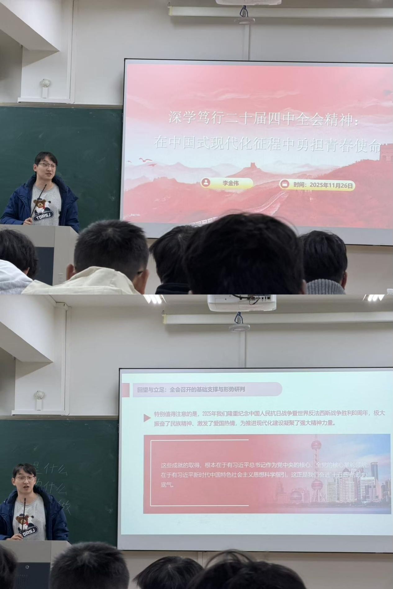 辅导员李金伟为25级新生带来主题为“深学笃行党的二十届四中全会精神:在中国式现代化征程中勇担青春使命”的课程,让全会精神以生动的方式走进新生的思想视野。