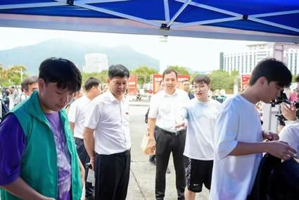 迎新当日,学校领导心系新生。赵敏校长深入学生寝室走访,细致询问新生住宿适应情况、生活需求,叮嘱大家尽快融入集体、开启充实的大学生活;庄兴忠副书记与师生亲切交谈,详细了解“学科探秘·智趣盲盒”“未来信箱”等迎新环节和新生报到情况、志愿者服务保障细节;王尧骏副校长来到学院迎新点,与新生交流并与新生合影留念,用亲切互动传递学校的温暖与期许。